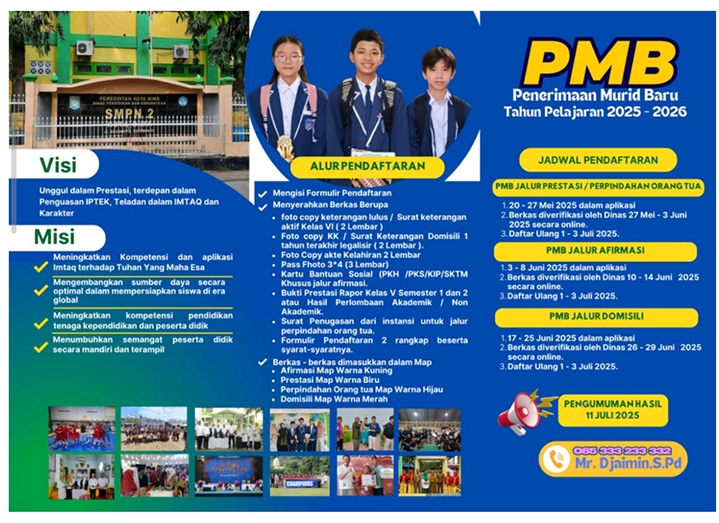 Kami mengimbau orang tua/wali untuk mengikuti seluruh rangkaian proses dan jadwal yang telah ditetapkan. Informasi lebih lanjut dapat ditanyakan langsung kepada Panitia SPMB SMPN 2 Kota Bima di sekolah.
