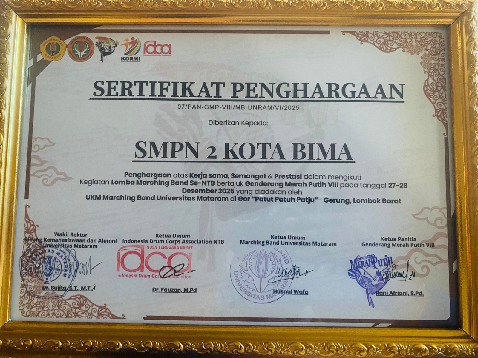 Mataram – SMP Negeri 2 Kota Bima kembali menorehkan prestasi membanggakan. Sekolah ini menerima Sertifikat Penghargaan atas kerja sama, semangat, dan prestasi dalam mengikuti Lomba Marching Band Se-NTB bertajuk “Genderang Merah Putih VIII” yang diselenggarakan pada 27–28 Desember 2025.