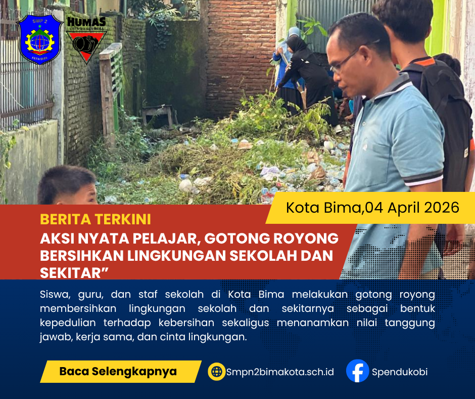 Kota Bima, 4 April 2026 — Wujud kepedulian terhadap kebersihan lingkungan ditunjukkan oleh para pelajar melalui kegiatan gotong royong yang melibatkan siswa, guru, dan staf sekolah. Kegiatan ini tidak hanya difokuskan pada area dalam sekolah, tetapi juga menjangkau lingkungan sekitar yang selama ini dipenuhi sampah.