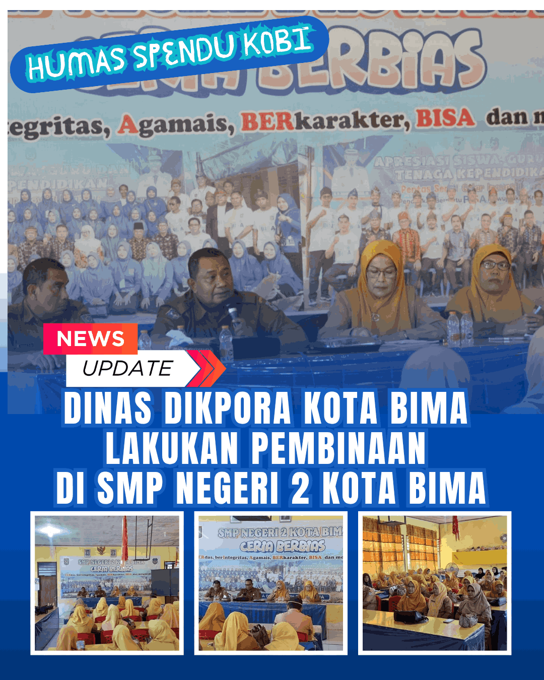 Kota Bima, 14 April 2026 – SMP Negeri 2 Kota Bima menerima kunjungan dari Dinas Dikpora Kota Bima dalam rangka pembinaan dan evaluasi kegiatan sekolah. Kegiatan ini meliputi TKA, proses KBM, serta pembinaan bagi tenaga pendidik dan kependidikan.