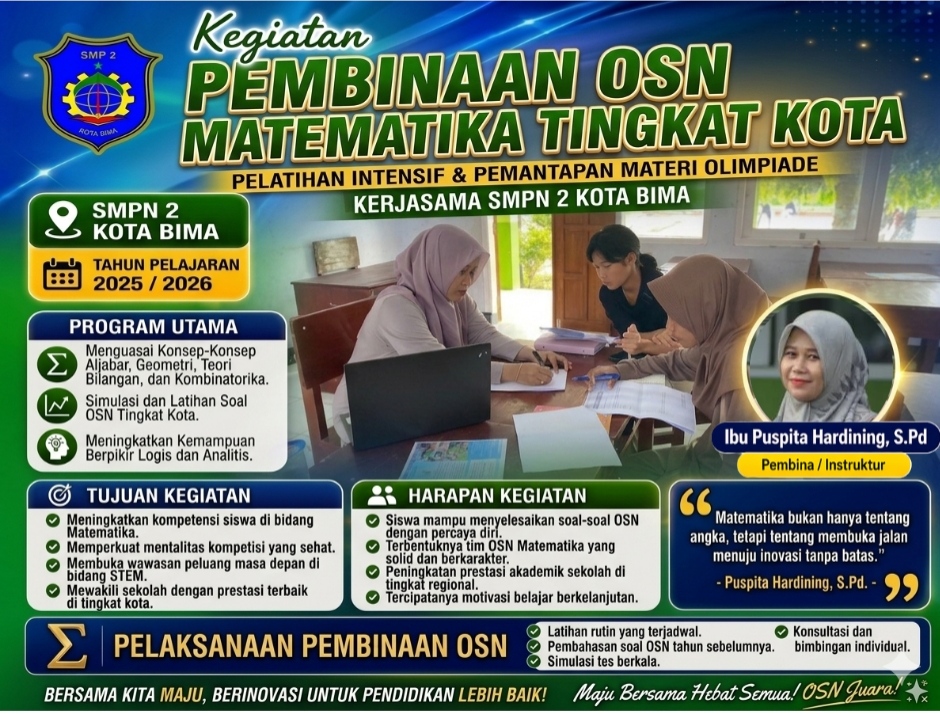 Kota Bima, 23April 2026 – SMP Negeri 2 Kota Bima terus menunjukkan komitmennya dalam meningkatkan kualitas pendidikan, khususnya di bidang akademik, melalui kegiatan Pembinaan Olimpiade Sains Nasional (OSN) Matematika Tingkat Kota. Program ini dilaksanakan sebagai bentuk pelatihan intensif dan pemantapan materi olimpiade bagi siswa yang memiliki potensi di bidang matematika.
