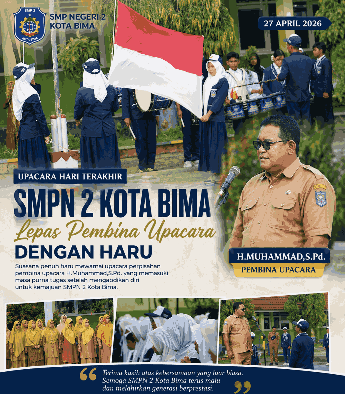 Kota Bima – SMP Negeri 2 Kota Bima menggelar upacara bendera yang berlangsung khidmat dan penuh haru sebagai momen kebersamaan di akhir masa tugas kepemimpinan sekolah, Senin (27/04/2026).