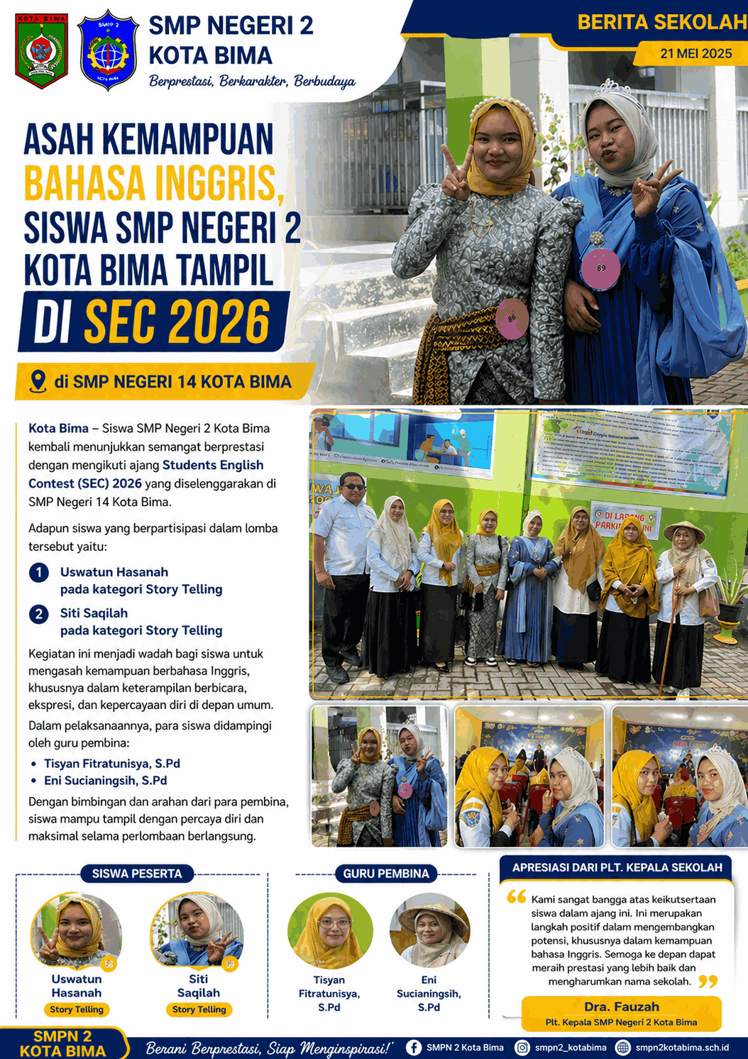 Kota Bima – Siswa SMP Negeri 2 Kota Bima kembali menunjukkan semangat berprestasi dengan mengikuti ajang Students English Contest (SEC) 2026 yang diselenggarakan di SMP Negeri 14 Kota Bima.
