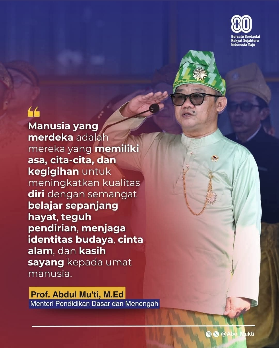 Jakarta, 17 Agustus 2025 – Dalam rangka memperingati Hari Ulang Tahun ke-80 Republik Indonesia, Menteri Pendidikan Dasar dan Menengah, Prof. Abdul Mu’ti, M.Ed, menyampaikan pesan penting tentang makna sejati kemerdekaan.