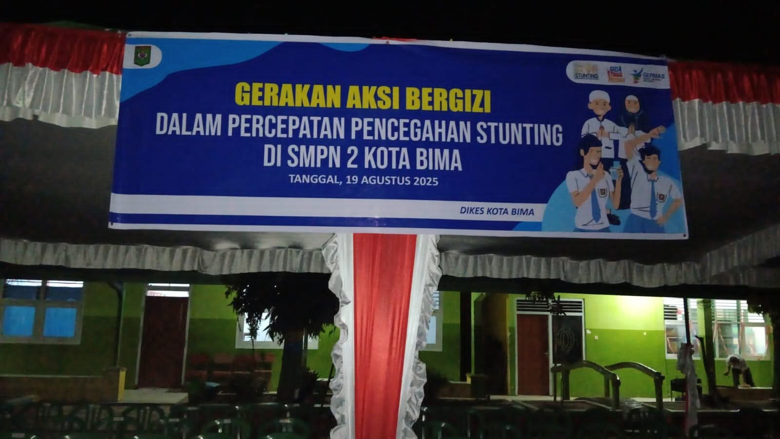 Sejak sore hari, para guru dan siswa tampak antusias menata area sekolah. Panggung utama dipasang spanduk besar bertuliskan “Gerakan Aksi Bergizi dalam Percepatan Pencegahan Stunting di SMPN 2 Kota Bima”, lengkap dengan dekorasi merah putih yang semakin menambah semarak suasana. Beberapa siswa turut membantu menata kursi, membersihkan lingkungan, serta memastikan segala perlengkapan acara siap digunakan.